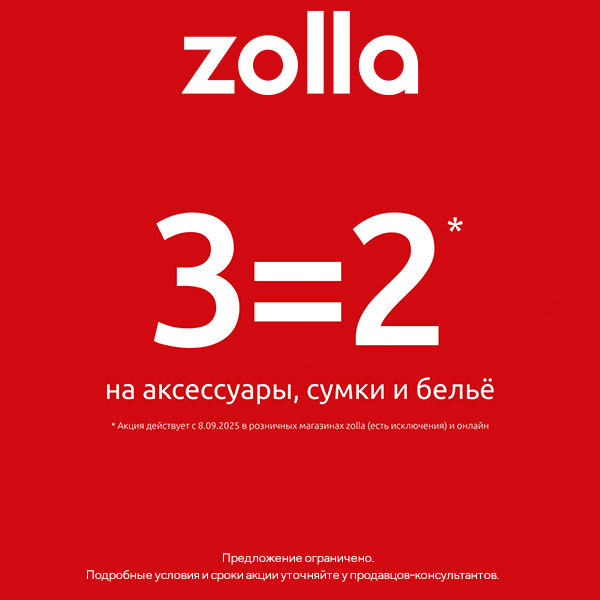 Межсезонная распродажа в zolla! Акция 3=2 на аксессуары, сумки и бельё! Количество товара ограничено. Подробности и сроки акции уточняйте у продавцов-консультантов отдела.